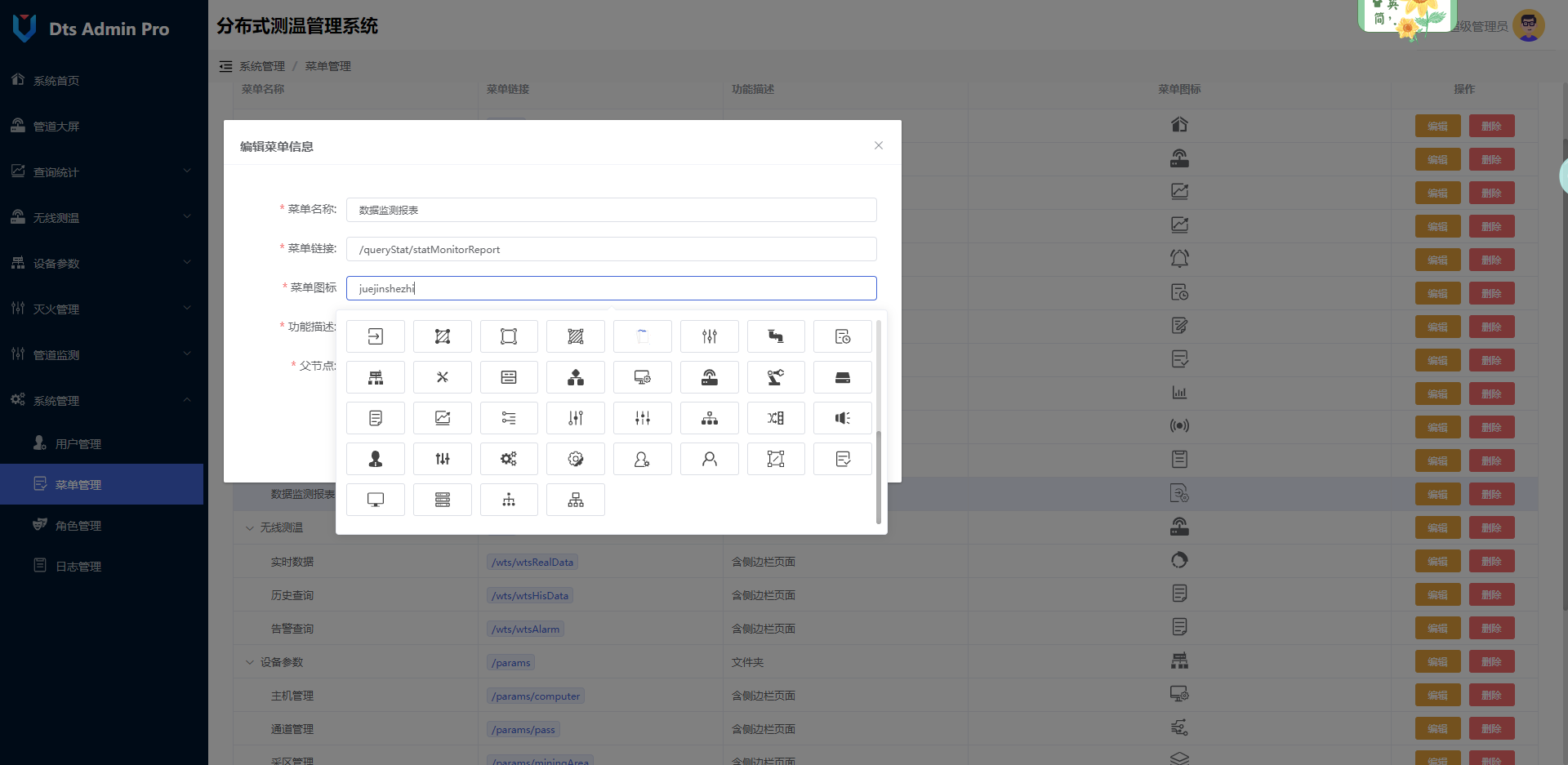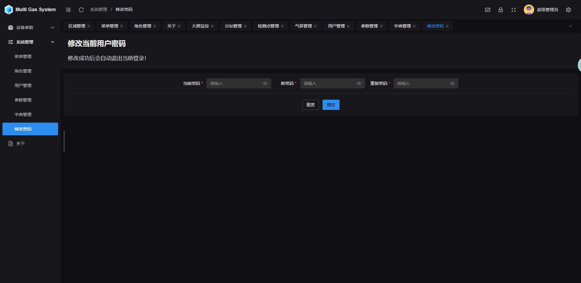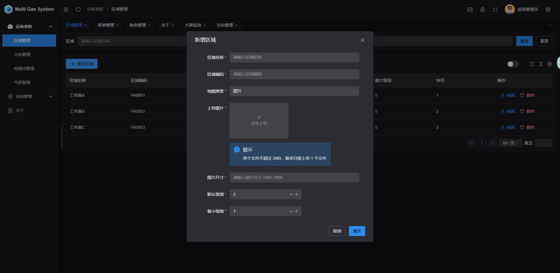 - 设备管理模块 (区域管理、分站管理、监测点管理、气泵管理)、系统管理(菜单、角色、用户、参数、字典、密码)